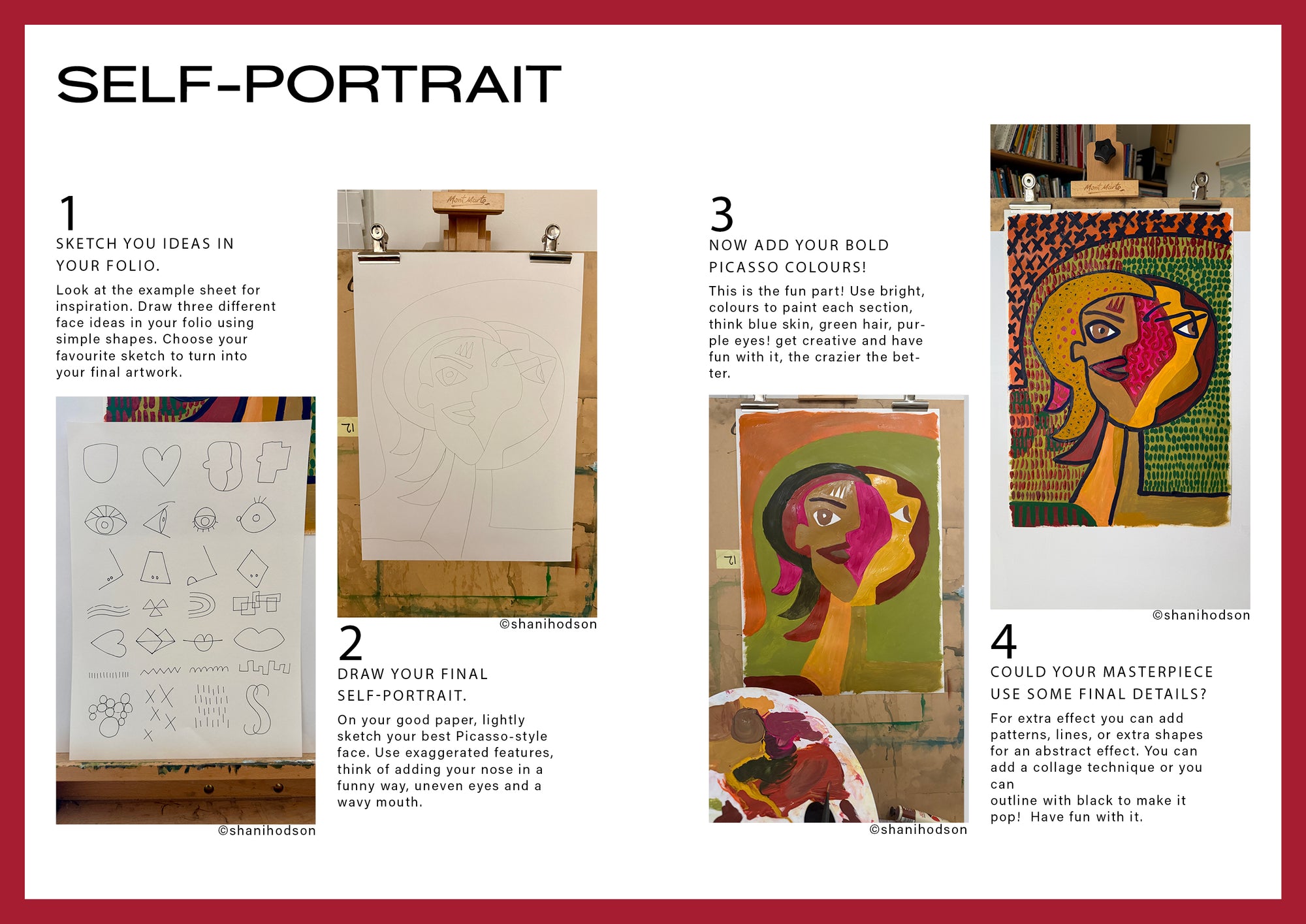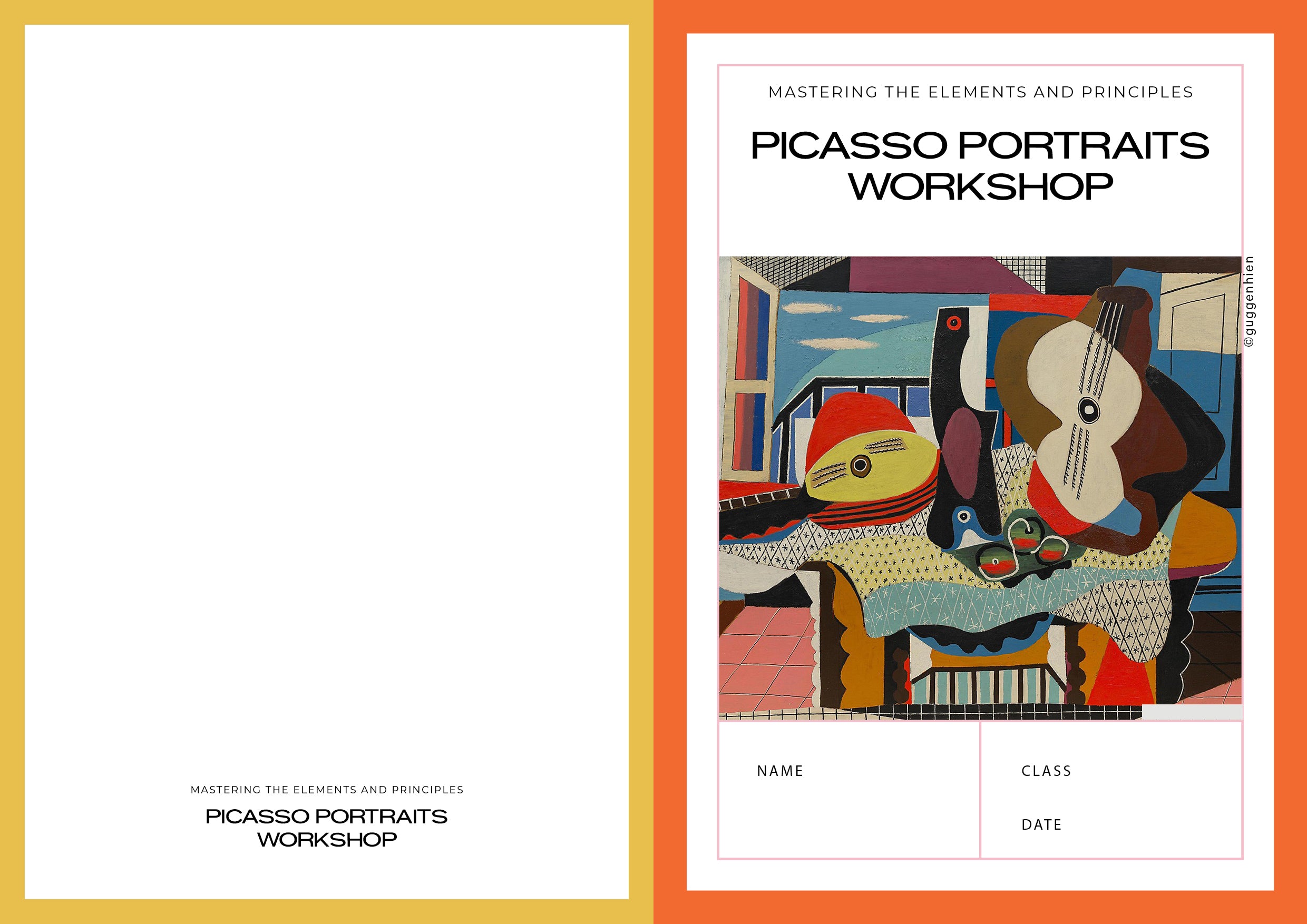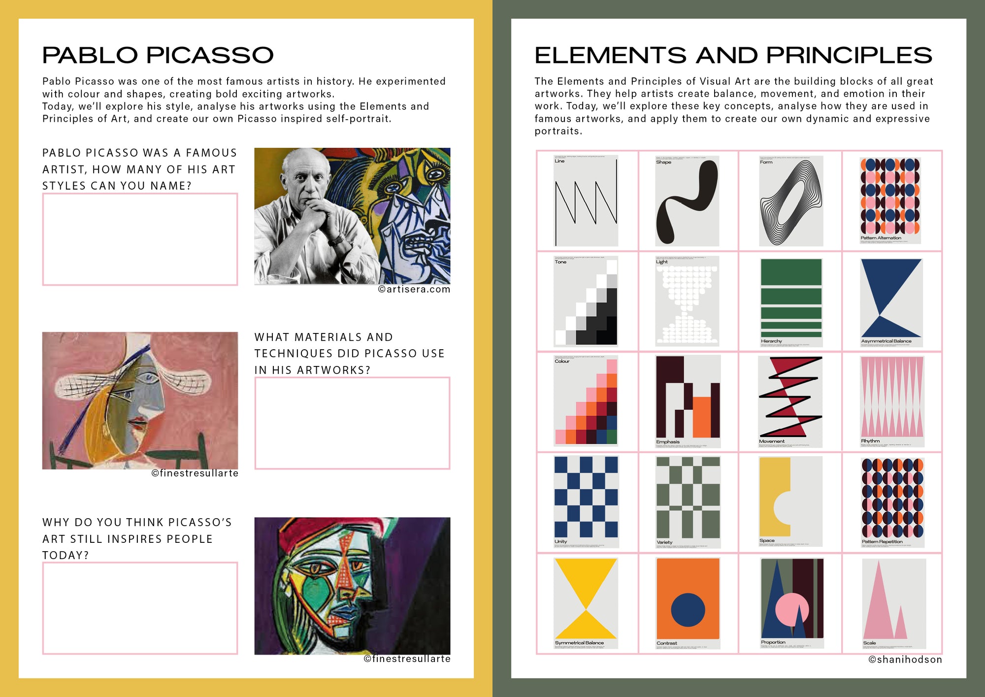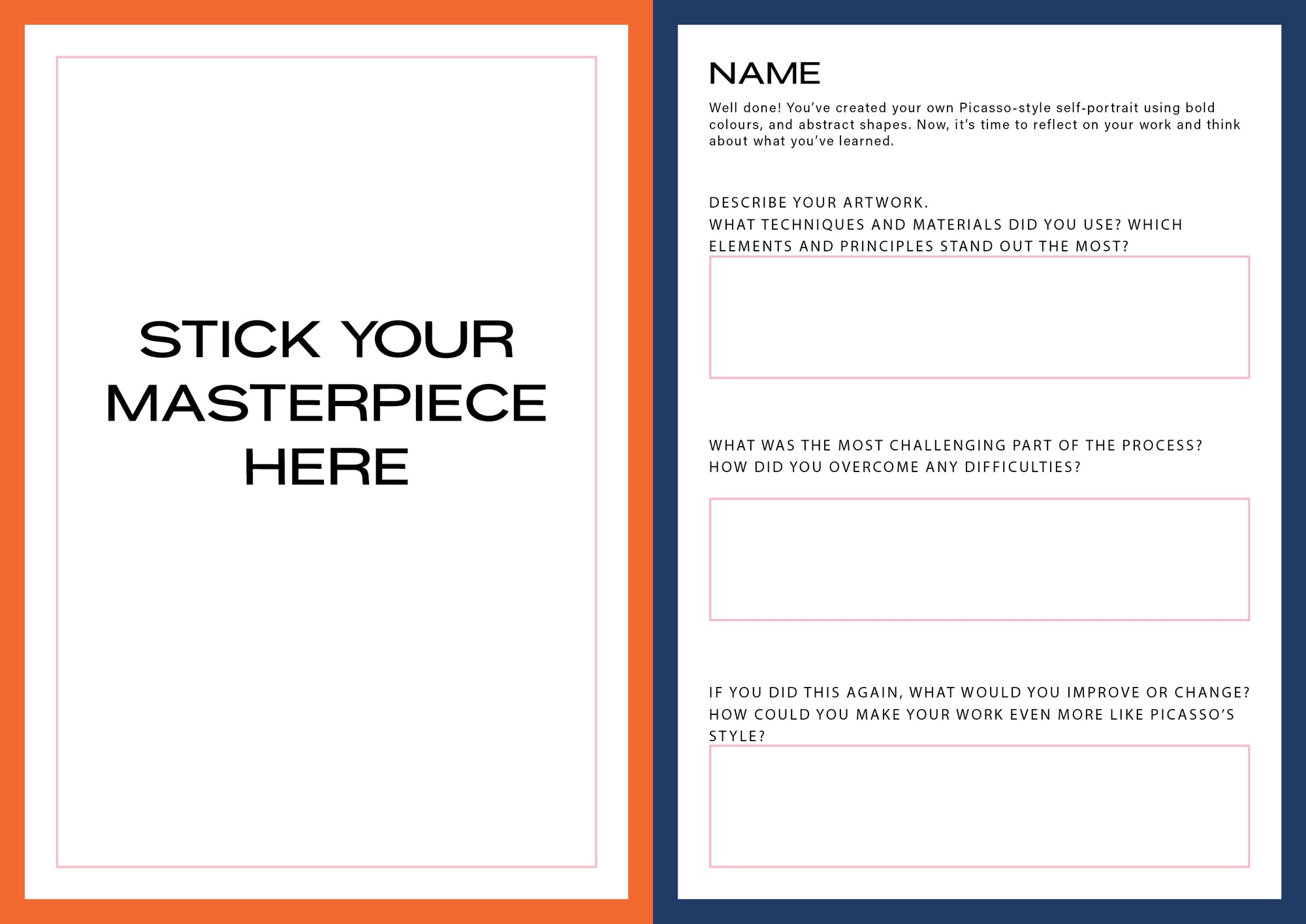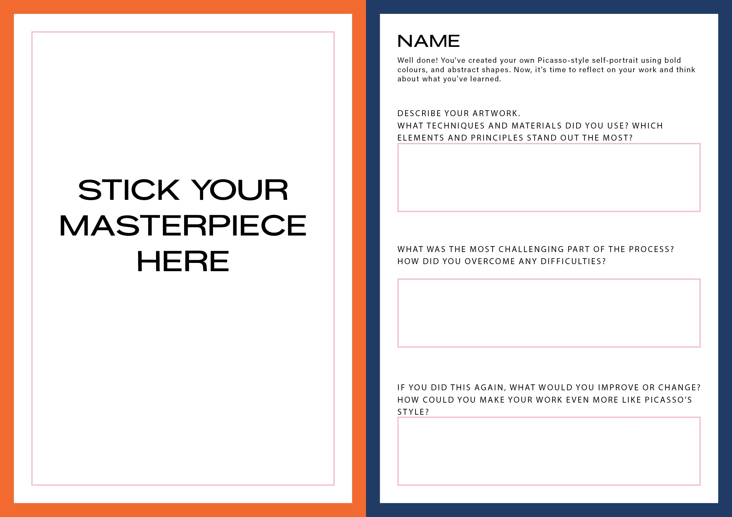 Building on this analysis, students then apply their learning by creating their own self-portrait, using Picasso’s abstract approach as inspiration. This practical task allows them to experiment with shape and form by fragmenting and reassembling their facial features in unexpected ways, reinforcing their understanding of abstraction and composition. The workbook serves as a scaffolded learning tool, guiding students through the creative process while prompting them to annotate and reflect on their work using the elements and principles.
