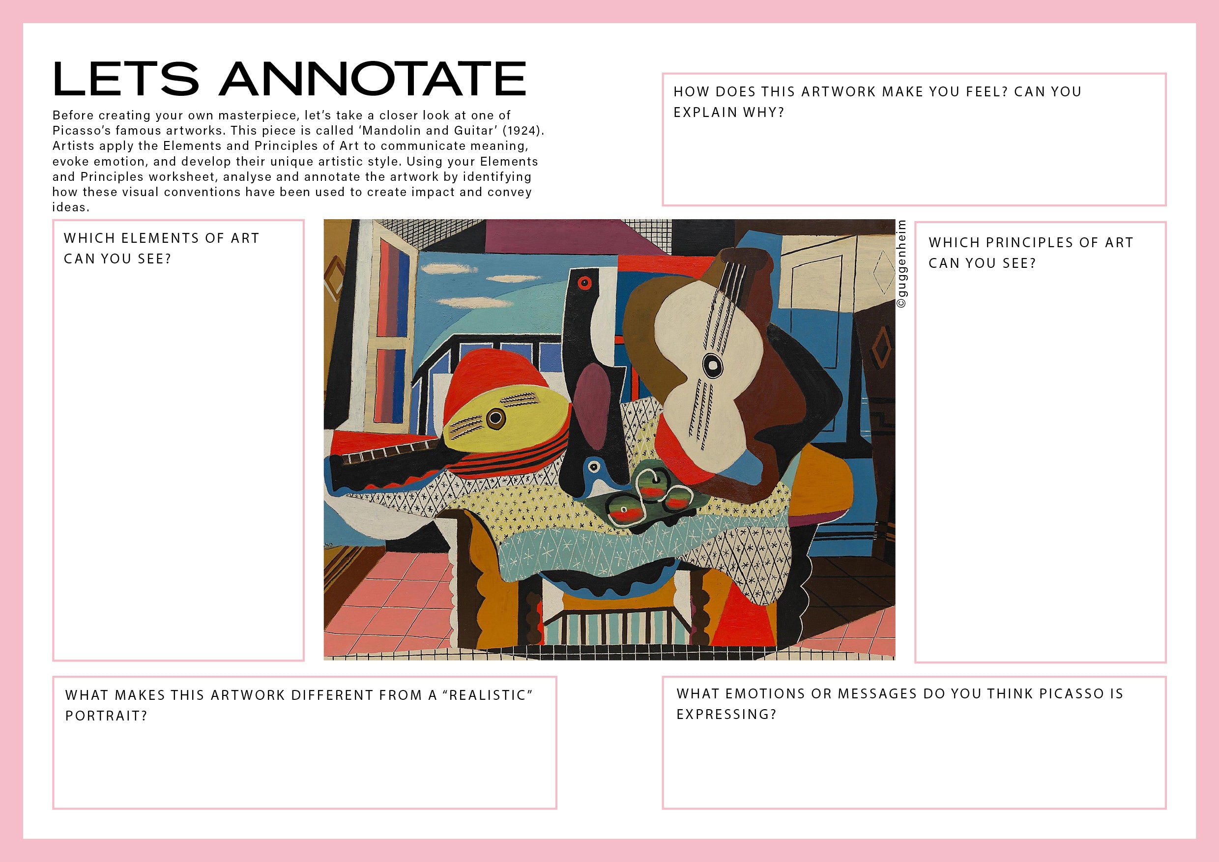 As the audience, students will critically analyse Picasso’s Mandolin and Guitar (1924) using an Elements and Principles of Art worksheet, identifying key artistic conventions and discussing their significance. This process aligns with the Developing Practises strand, as students engage in reflective discussions about Picasso’s influence and the impact of abstraction on modern art.